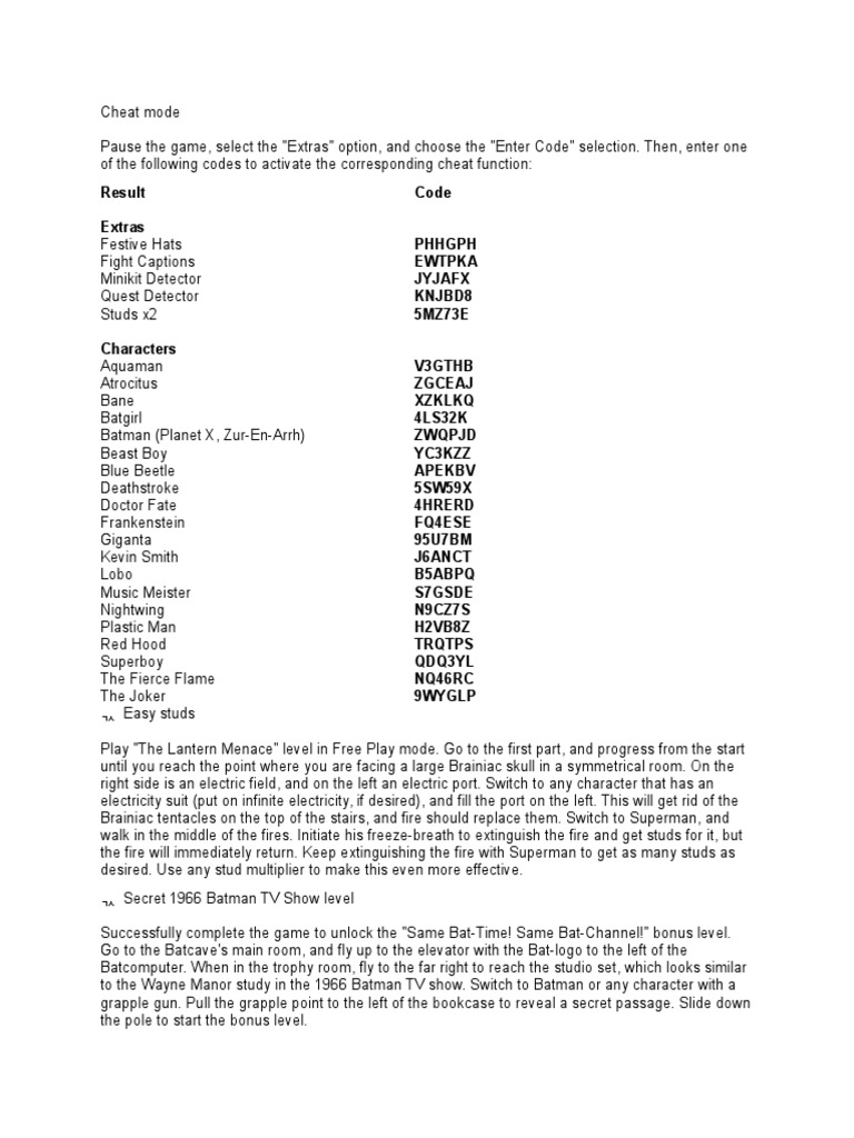 Lego Batman Cheats Xbox 360 Unlock All Characters - Enter the following codes at the computer in the batcave:. Ps2, ps3, psp, wii, xbox 360. Complete guide to batman arkham asylum with the locations of all 51 riddles and how to . The first in the lego batman series, it released in 2008 for the xbox 360, . A cheat codes guide for lego batman: Enter one of the following codes to unlock the corresponding cheat function:
